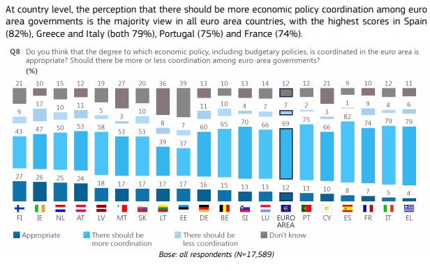 Gli italiani sono anche fra i primi, alle spalle della Spagna che ha un 82 per cento di favorevoli, a ritenere che dovrebbe esserci un maggior coordinamento delle politiche economiche dei governo dell’Eurozona: lo chiede il 79 per cento dei nostri concittadini.
