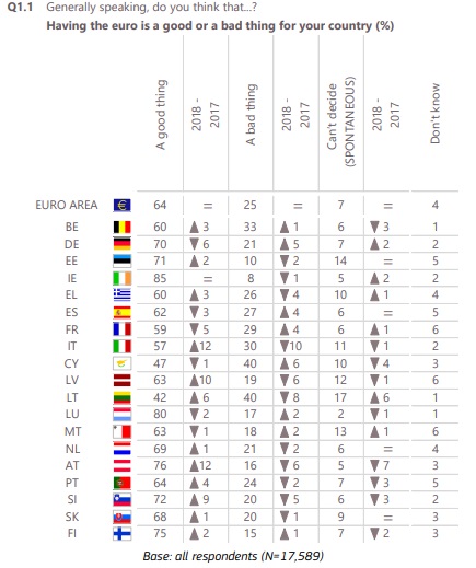 Va però detto che, secondo questa rilevazione effettuata ad ottobre scorso (17.589 interviste telefoniche nei 19 Paesi dell’euro), restiamo tra i meno convinti, in quantità di cittadini, poiché dietro agli italiani ci sono solo ciprioti e lituani, tutti gli altri hanno maggiore positività. Però l’Italia si avvicina alla media Ue, che è al 64 per cento, in una classifica guidata dall’Irlanda, dove i sostenitori della moneta unica sono all’85 per cento.