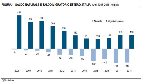Il saldo naturale tra nati e morti nel 2018 è negativo (-187mila), toccando un nuovo record storico dopo quello del 2017 (-191mila).