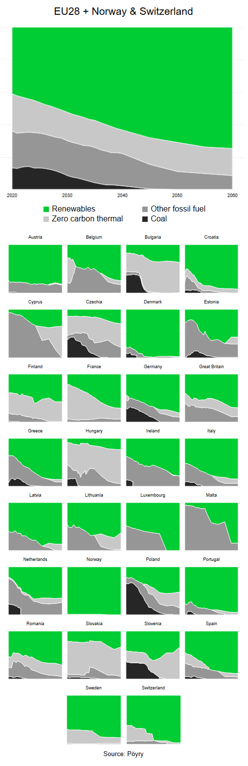 Il grafico mostra l’ultima visione di scenario di Pöyry per la generazione del settore energetico fino al 2060 basata su una economia decarbonizzata all’80% entro il 2060. Le fonti rinnovabili crescono enormemente nel tempo e più nel lungo periodo nucleare, CCS e idrogeno fanno la loro comparsa nella produzione a zero carbonio. “Ciò che è vitale nel fornire questo risultato – sottolinea lo studio – è il coinvolgimento del lato della domanda nel mercato”.