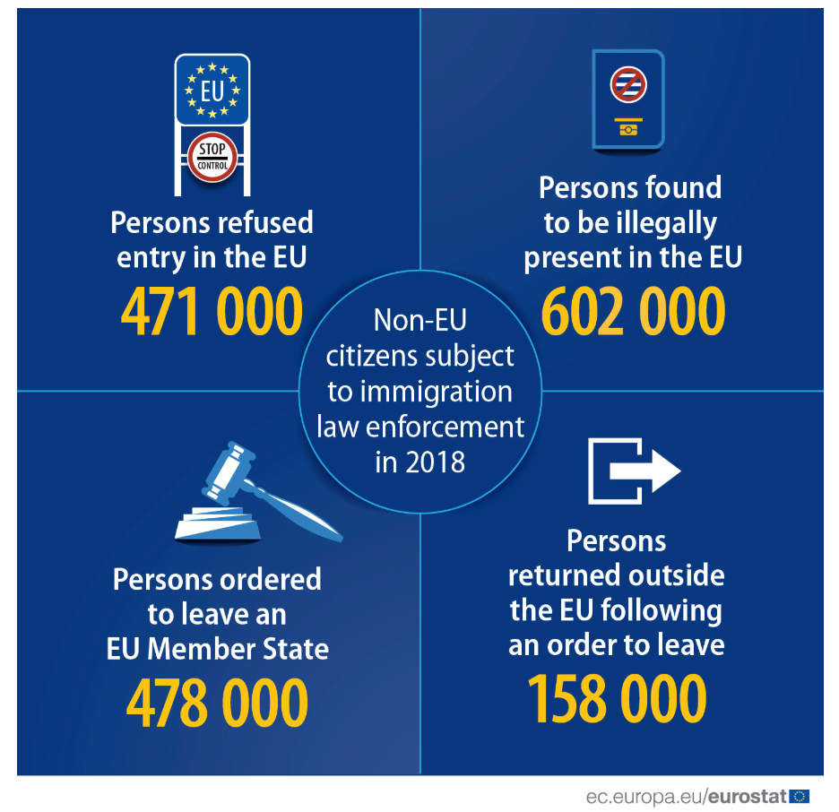 A seguito della permanenza illegale, l’ordine di lasciare l’Ue è stato emesso per 478.000 persone, il 7% in meno rispetto al 2017 quando erano stati emessi invece 516.100 ordini di rimpatrio. Di questi solamente 198.000 cittadini di paesi terzi sono stati rimpatriati, di cui 40.000 anche in altri stati membri dell’Ue mentre 158.000 in paesi terzi. Quest’ultimo dato ha segnato un decremento del 17% confrontato con il 2017 nel quale le persone che hanno lasciato l’Ue si attestò a 189.900 unità, quasi 40.000 persone in più.