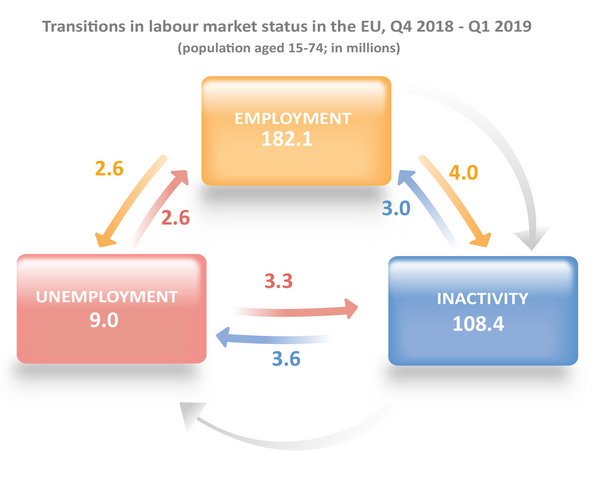 La transizione disoccupazione-occupazione ha visto lo stesso numero di persone in entrata e in uscita: 2,6 milioni di persone hanno perso lavoro, altrettante lo hanno trovato nello stesso periodo, lasciando praticamente invariato a 182,1 milioni il numero di persone con un impiego. Però, guardando alla transizione lavoro-inattività, si registra un saldo negativo. Tra ottobre-dicembre 2018 e gennaio-marzo 2019 tre milioni di europei hanno trovato un impiego, uscendo dalla fase di inattività (chi non ha lavoro, non fa tirocini, e non cerca), a fronte di quattro milioni di persone che da una situazione lavorativa sono finiti in una fase inattiva.