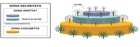 Nello stesso anno anno, dal momento che la Xylella si era diffusa in alcune parti della Puglia da più di due anni, la sua eradicazione non era più possibile. Conseguentemente, la Commissione ha modificato la propria decisione prevedendo, eccezionalmente, per i territori infetti in modo stabile, misure di contenimento anziché di eradicazione. Tali misure di contenimento, dirette ad impedire la diffusione della Xylella, comprendono il monitoraggio del territorio interessato nonché l’abbattimento immediato delle sole piante infette situate, in particolare, in una fascia della zona infetta per una larghezza di 20 km calcolati a partire dal “bordo” esterno della zona, quindi una fascia limitrofa alla zona cuscinetto, che attraversa le province di Brindisi e di Taranto da Est ad Ovest.