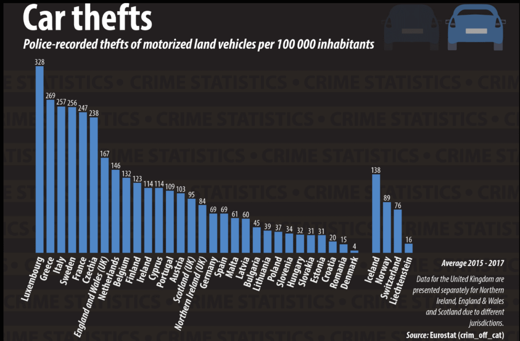 I dati rilevano inoltre che nei paesi dell’est e del nord Europa ci sia la più bassa propensione ai ladrocini di macchine. In particolare, in Danimarca si è registrato il numero più basso (4 : 100mila abitanti), seguita da Romania (15 : 100mila abitanti), Croazia (20 : 100mila abitanti) Slovacchia ed Estonia (alla pari con 31 : 100mila abitanti)