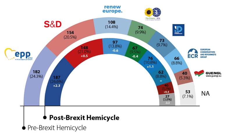 Con la partenza dei deputati britannici di ogni gruppo, e l’arrivo dei nuovi eletti alle ultime elezioni, cambia anche la composizione dei gruppi in Parlamento. Il prima e dopo Brexit è mostrato nella foto qui sotto: