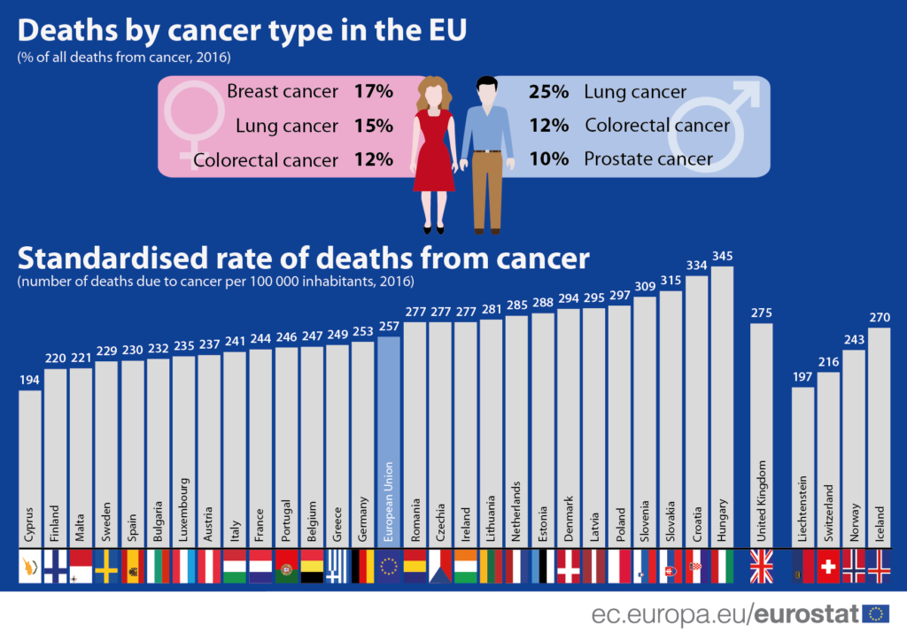 In Europa le neoplasie al seno sono la principale causa di morte per cancro delle donne (84.300 casi, pari al 16% di tutte le morti femminili per tumore). Ma le donne risultano più colpite da tumori maligni al sistema respiratorio (74.100 casi mortali ai polmoni, pari 14% del totale) e al colon (62.300 vittime, pari al 12% del totale). Gli uomini sono vittime soprattutto di cancro a polmoni, bronchi o trachea, responsabile di una morte su quattro in caso di tumore maligno (165mila decessi, il 25% del totale). Un caso su dieci colpisce la prostata (65.200 decessi, il 10% del totale).