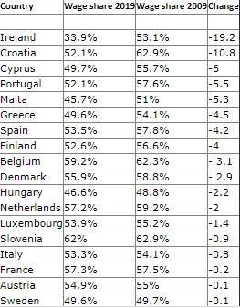 L’Irlanda ha visto il più grande calo della percentuale del PIL erogato in salari al 19% *, davanti a Croazia (11), Cipro (6), Portogallo (5) e Malta (5).
