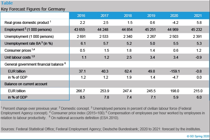 Secondo il rapporto è probabile che il prodotto interno lordo si sia ridotto dell’1,9% nel solo primo trimestre del 2020. Nel secondo trimestre, crollerà del 9,8 per cento a causa della chiusura per l’emergenza sanitaria. Sarebbe il calo più netto mai registrato in Germania da quando sono iniziati i conti nazionali trimestrali nel 1970; è anche più che raddoppiato rispetto al declino registrato durante la crisi finanziaria globale nel primo trimestre del 2009.