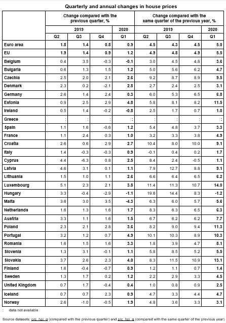 Tra gli Stati membri per i quali sono disponibili i dati, i maggiori aumenti annuali dei prezzi delle abitazioni nel primo trimestre 2020 sono stati registrati in Lussemburgo (+ 14,0%), Slovacchia (+ 13,1%), Estonia (+ 11,5%), Polonia (+ 11,3%) e Portogallo (+ 10,3%), mentre i prezzi sono diminuiti solo in Ungheria (-1,2%).