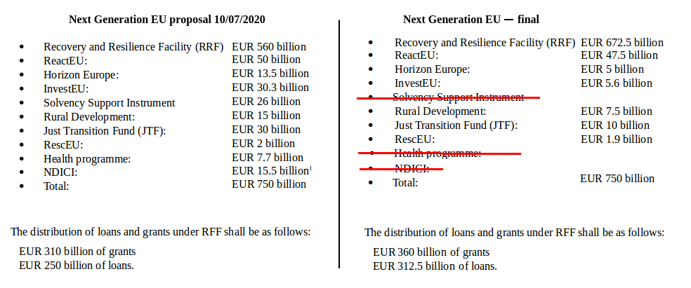 La proposta iniziale del vertice dei leader senza fine prevedeva un meccanismo per la ripresa da 750 miliardi di euro, costituiti per due terzi (500 miliardi) da garanzie e un terzo (250 miliardi) da prestiti. Alla fine restano i 750 miliardi, ma suddivisi in parti quasi uguali tra sovvenzioni (390 miliardi) e prestiti (360 miliardi). Si tratta di un’affermazione di Austria, Danimarca, Svezia e Paesi Bassi. Alla richiesta franco-tedesca di non scendere sotto la soglia di 400 miliardi di euro di garanzie nella composizione del recovery fund, i cossiddetti ‘frugali’ hanno continuato per tutto il tempo a giocare al ribasso. Alla fine ce l’hanno fatta, imponendo la loro linea. Secondo l’ultima proposta Michel nel nuovo strumento anti-recessione, temporaneo e attivo fino al 2023, concepito per far fronte alla crisi sanitaria del Covid, vengono azzerate le risorse per sanità e salute, solvibilità delle imprese e strumento di vicinato, sviluppo e cooperazione internazionale
