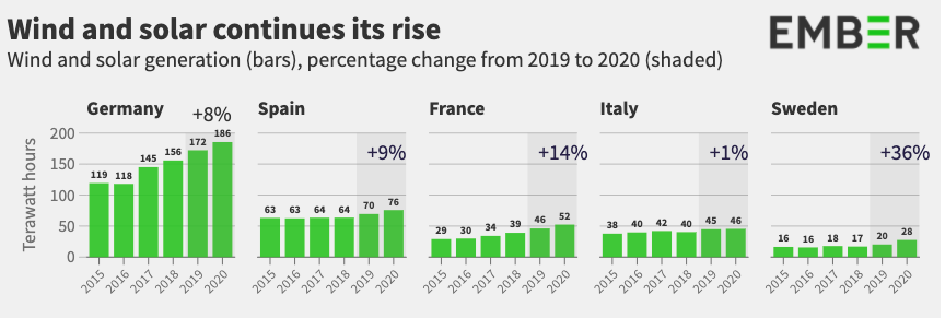 Nei piani della Commissione Europea c’è l’idea di alzare al 40 per cento la quota di rinnovabili nell’Ue. La generazione eolica e solare è aumentata rispettivamente del 9 per cento e del 15 per cento, insieme hanno generato un quinto dell’elettricità europea nel 2020. Ciò significa che l’elettricità europea nel 2020 era più pulita del 29 per cento rispetto al 2015. I maggiori aumenti sono stati nei Paesi Bassi (40 per cento), Svezia (36 per cento) e Belgio (28 per cento), e il rapporto mette in evidenza il fatto che i risultati sulle rinnovabili sono diretta conseguenza di “una volontà politica sostenuta”, mentre “alcuni Paesi continuano a rimanere indietro nonostante le eccellenti condizioni solari ed eoliche” dei loro territori. Tra questi viene menzionata anche l’Italia che, insieme ad altri cinque paesi (Austria, Portogallo, Repubblica Ceca, Romania e Slovacchia) dal 2015 a oggi ha fatto registrare una crescita prossima allo zero.