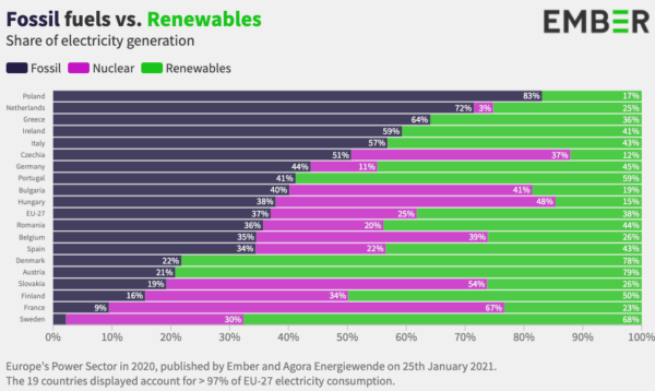 Come si vede dal grafico sopra Polonia e Repubblica Ceca sono gli unici due Paesi con una quantità di produzione fossile più di quattro volte superiore a quella prodotta da fonti rinnovabili, che non raggiunge neanche il 20 per cento del mix nazionale.