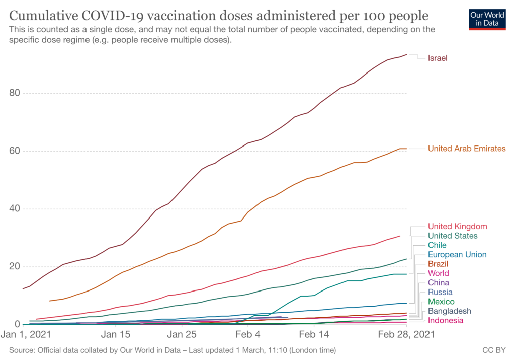 Nonostante i tentativi delle Istituzioni di accelerare il processo, EMA ha autorizzato tre vaccini (BioNTech-Pfizer, Moderna, AstraZeneca) e auspicabilmente un quarto dovrebbe arrivare l’11 marzo della farmaceutica Johnson e Johnson, che dovrebbe consentire all’Unione di andare più veloce con la vaccinazione anche considerato che a differenza dei primi tre prevede una sola somministrazione. Il brusco taglio delle consegne annunciato da AstraZeneca alla fine di gennaio ha significato un rallentamento delle campagne vaccinali negli Stati membri, che sono ancora piuttosto indietro rispetto ad altri Paesi occidentali.