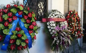 In sala note di musica classica. Con i gonfaloni, accanto alla bara e alle pareti le tantissime corone di fiori delle istituzioni nazionali e internazionali e delle comunità a cui David Sassoli era legato e dov