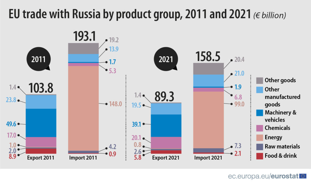 A livello più generale, guardando il dato dei flussi commerciali UE-Russia in modo più complessivo, emerge che nel 2021 quello russo risultava il quinto partner per le esportazioni di beni dell’UE (4,1 per c cento delle esportazioni extra-UE, pari a 89 miliardi di euro) e il terzo partner per le importazioni di beni dell’UE (7,5 per cento delle importazioni extra-UE, equivalente a 158 miliardi di euro).