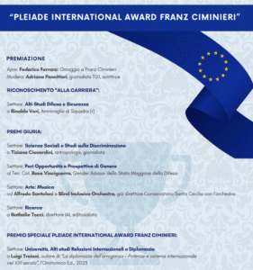 All’evento, presieduto e moderato dalla giornalista Velia Iacovino, parteciperanno anche la deputata Laura Boldrini, Presidente del Comitato permanente della Camera sui diritti umani nel mondo, e la presidente di Pleiade International Award Franz Ciminieri, Simona Agostini. Alla fine del convegno ci sarà poi spazio per le premiazioni nei diversi settori. Il premio per la carriera per gli “alti studi difesa e sicurezza” andrà a a Rinaldo Veri, ammiraglio di squadra, mentre i premi della giuria saranno assegnati a Tiziana Ciavardini (scienze sociali e studi sulla discriminazione), alla tenente colonnello Rosa Vinciguerra (pari opportunità e prospettive di genere), ad Alfredo Santoloci e Blind Inclusive Orchestra nel settore “arte e musica” e a Nathalie Tocci per la “ricerca”. Il premio speciale Pleiade International Award Franz Ciminieri sarà assegnato al professore di Relazioni internazionali Luigi Troiani, autore di “La diplomazia dell’ arroganza – Potenze e sistema internazionale nel XXI secolo”, nel settore “università, alti studi relazioni internazionali e diplomazia”.