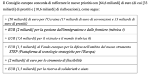 Secondo la proposta di Michel, l’aumento di budget arriverebbe a un totale di 64,6 miliardi di euro, di cui 33 miliardi di prestiti e 10,6 miliardi di riallocazioni dalle risorse del quadro esistente . Michel propone di mantenere le risorse per l’Ucraina a 50 miliardi di euro (di cui 17 miliardi di euro di sussidi a fondo perduto e 33 miliardi di euro di prestiti); 2 miliardi per la gestione dell’immigrazione e delle frontiere e 7,6 miliardi per il vicinato e il mondo; 1,5 miliardi destinati al Fondo europeo per la difesa nell’ambito del nuovo strumento Step (Piattaforma di tecnologie strategiche per l’Europa); altri 2 miliardi di euro per lo strumento di flessibilità e infine 1,5 miliardi per la riserva di solidarietà e aiuto.