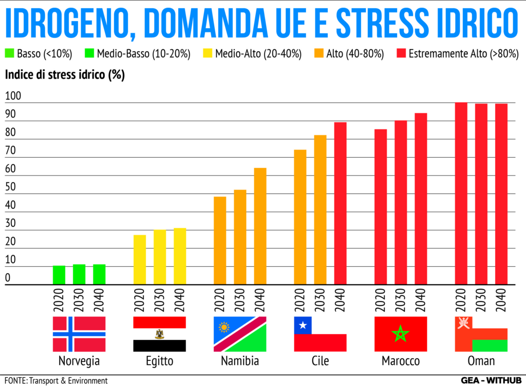 L’UE si sta rivolgendo principalmente a sei Paesi per le sue necessità tra Europa (Norvegia), sud America (Cile), Africa (Egitto, Marocco e Namibia) e Medio Oriente (Oman). In questa sua ricerca di partner l’EU sta però producendo effetti collaterali di vasta portata. Soprattutto per quanto riguarda l’accesso all’acqua. Per produrre le 2,6 milioni di tonnellate di H2 che si prevede di esportare nell’UE nel 2030, “sarebbero necessari tra 55 e 80 milioni di tonnellate di acqua, l’equivalente di 32mila piscine olimpioniche ogni anno”. Per cui, sottolinea il documento, tutti i paesi esaminati, tranne la Norvegia, “si troveranno ad affrontare una significativa scarsità d’acqua nei decenni a venire”.