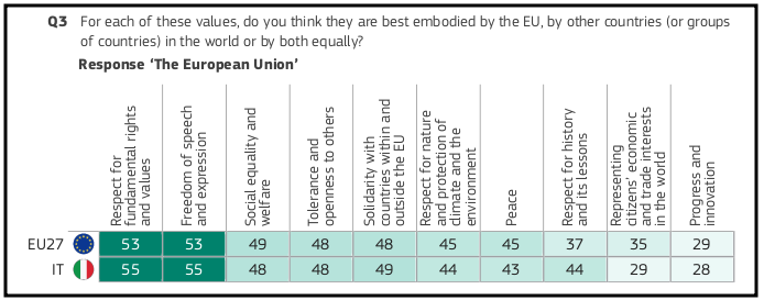 Gli italiani sembrano avere dubbi su come si viva nel proprio Paese per ciò che riguarda diritti e libertà di base, visto che la stessa maggioranza (55 per cento) sostiene anche che, dovendo fare un paragone con l’Italia, il rispetto di diritti e valori fondamentali sono più incarnati a livello di Unione europea. Una percezione, quella degli italiani in Italia, che conferma la realtà fotografata da Bruxelles pochi giorni fa, all’insegna di tanto lavoro da fare in senso migliorativo.