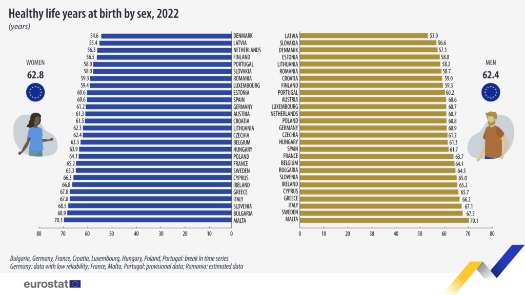 Dall’Italia comunque un buon biglietto da visita. L’età media in buona salute è ben oltre la media dell’Unione europea. Guardando a tutti i dati nel complesso, nel 2022 il numero di anni di vita in buona salute alla nascita nell’Unione era in media di 62 e sette mesi. Tradotto per genere: 62 anni e 10 mesi per le donne e 62 anni e cinque mesi per gli uomini. Gli italiani insomma insegnano a come godersi la vita e restare lontano dal medico, nonostante una popolazione tra le più anziane d’Europa.
