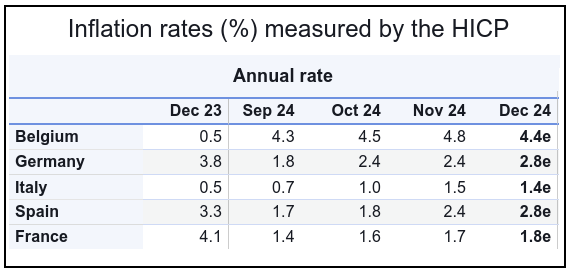 Tra le principali economie dell’eurozona l’istituto di statistica europeo stima aumenti dell’inflazione in Germania e Spagna, entrambe con aumenti attesi di 0,4 punti percentuali al 2,8 per cento. In controtendenza l’Italia, dove l’inflazione resta sotto la media e per di più è attesa anche in flessione.