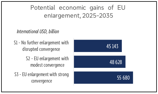 In termini assoluti un allargamento perfettamente riuscito potrebbe significare, secondo le stime prodotte a Bruxelles, un aumento della ricchezza prodotta nell’Ue di 55.860 miliardi di dollari.