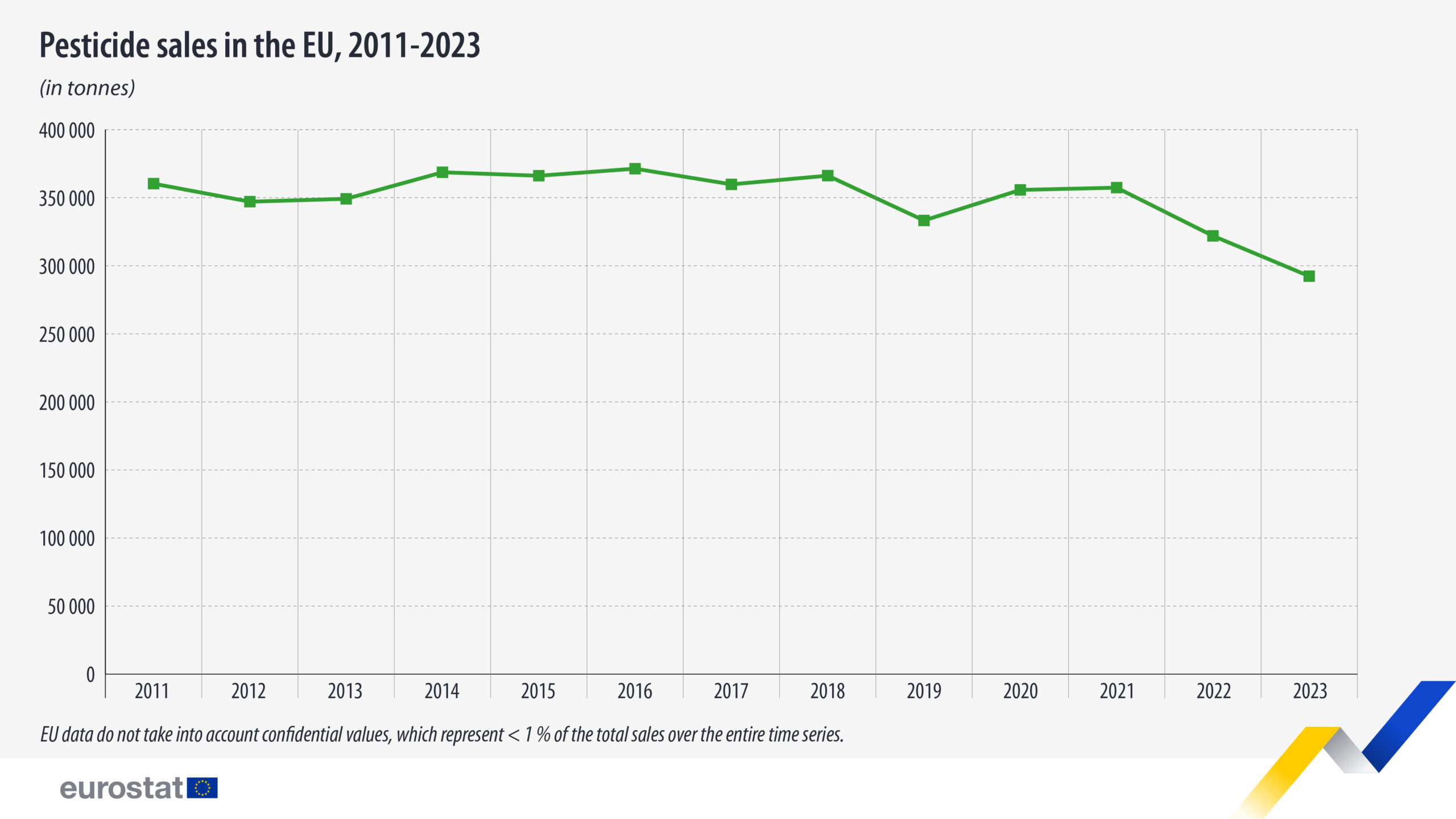 Bruxelles – Nel 2023, nell’Ue sono state vendute circa 292.000 tonnellate di pesticidi, il livello più basso dall’inizio della serie di rilevazione dei dati nel 2011, segnando un calo del 9 per cento (pct) rispetto al 2022 e del 18 pct rispetto al 2021.