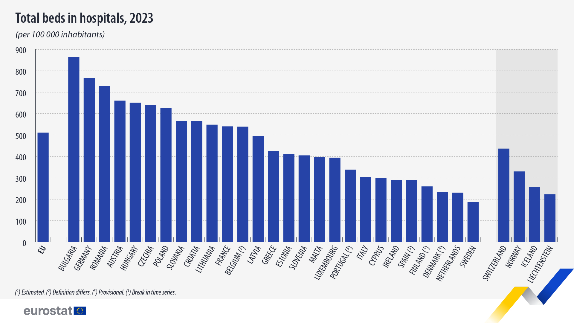 Tra i 27 Ue, la Bulgaria ha registrato il rapporto più elevato di posti letto ospedalieri rispetto alla popolazione, con una media di 864 ogni 100 mila abitanti. Segue la Germania con 766, la Romania con 728, l’Austria con 660 e l’Ungheria con 651. Al contrario, nel 2023 sette Paesi membri avevano meno di 300 posti letto ospedalieri ogni 100 mila abitanti: fanalino di coda la Svezia (187), poi i Paesi Bassi (231), la Danimarca (233), la Finlandia (260), la Spagna (288), Irlanda (289) e Cipro (298). L’Italia appena sopra la soglia dei 300 posti letto ogni 100 mila abitanti, con 308.