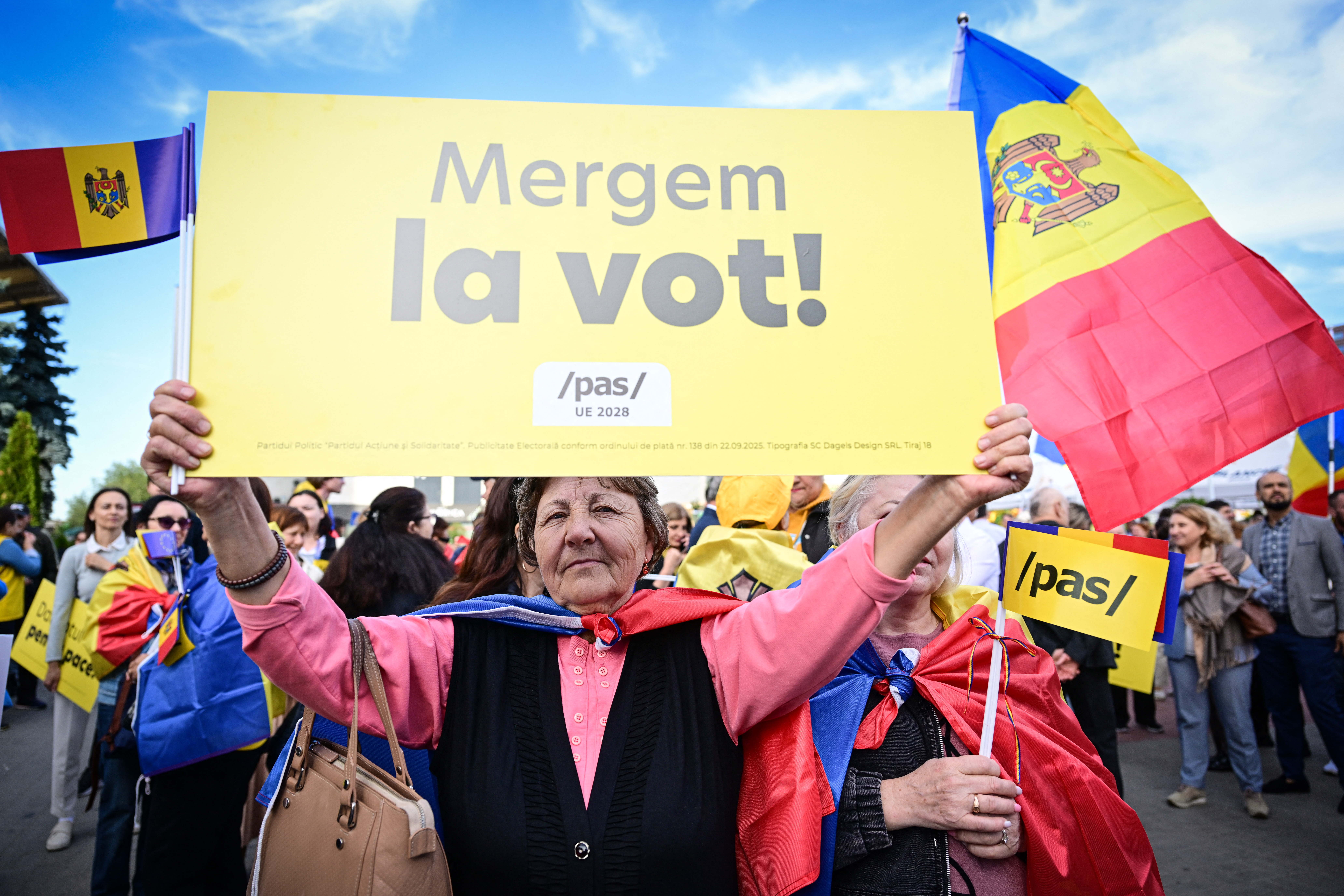 A supporter of Action and Solidarity Party PAS hold a pancarte reading "We go to vote"!  during a rally and march in Chisinau September 26, 2025 ahead of parliamentary elections.(Photo by Daniel MIHAILESCU / AFP)