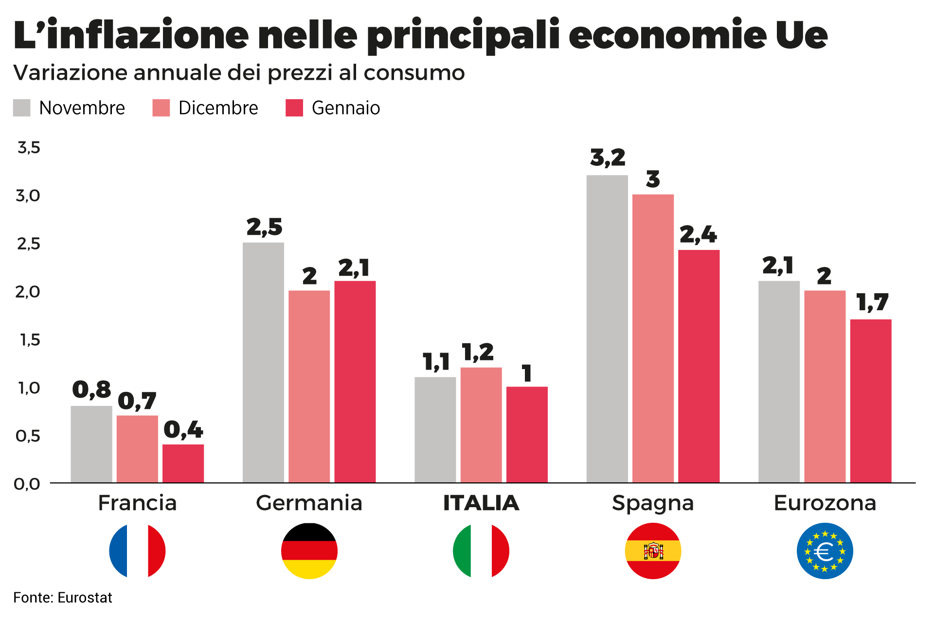 Tra i Paesi dell’area euro (che dal primo gennaio 2026 include anche la Bulgaria), quelli che presentano i tassi di inflazione annua più alti a febbraio 2026 sono la Slovacchia, che registra l’inflazione più elevata con il 4,0 per cento, segue la Croazia con un tasso del 3,9 per cento e l’Estonia e la Lituania con il 3,2 per cento. L’Italia registra un’inflazione stimata all’1,6 per cento, in aumento rispetto all’1,0 per cento di gennaio, ma comunque al di sotto della media dell’area euro (1,9 per cento). Al contrario, il tasso più basso si registra a Cipro (0,9 per cento). È importante notare che questi dati si basano su stime flash e che i dati completi e definitivi per tutti i Paesi dell’Unione Europea saranno pubblicati il 18 marzo 2026.