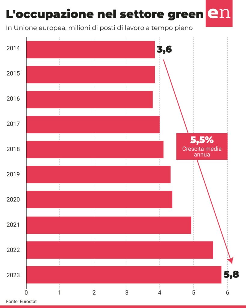 Quello dell’economia ambientale è un mondo piuttosto ampio e variegato, che comprende sia le attività relative alla protezione dell’ambiente – come la gestione dei rifiuti e delle acque reflue e altre attività di tutela ambientale – sia i settori lavorativi legati alla gestione delle risorse (misure di efficienza energetica nell’edilizia, produzione di energia rinnovabile, gestione forestale). Tra le attività prese in considerazione dal report odierno, il settore “Aria Pulita ed Energia” è stato quello che più ha contribuito alla crescita dell’occupazione green nel 2023. Rispetto al 2022, i posti di lavoro creati in questo ambito occupazionale – che include la produzione di energia rinnovabile e di auto elettriche – sono cresciuti di circa 1,7 volte nel 2023. “Un incremento”, spiega Eurostat, “derivante sia dalla produzione di energia rinnovabile in sé che dalla fabbricazione di tecnologie e apparecchiature per le rinnovabili e l’efficienza energetica, oltre che dalla fornitura di servizi correlati quali installazione, ingegneria e ricerca”. Anche nel lungo periodo la crescita occupazionale risulta piuttosto significativa: dagli 0,6 milioni di posti di lavoro equivalenti a tempo pieno nel 2014, si è passati a 1 milione del 2023 per un aumento pari al 70 per cento nel giro di dieci anni.