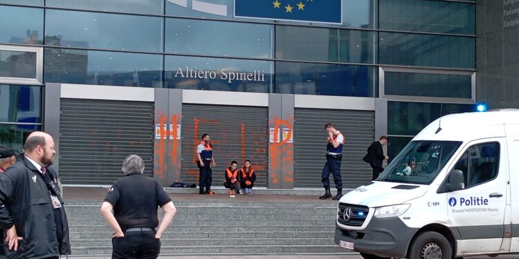 Brussels -The entrance to the European Parliament in Brussels was ‘colored’ to draw attention to practices and models against the environment and sustainability. Four very young activists targeted (but failed) the doors of the elected European Union institution with orange paint, leaving handprints on the entrance shutters and beginning to write what was supposed to be the desperate slogan “Help the planet,” not completing the job due to the arrival of law enforcement officers who stopped the paintbrushes before they could finish.