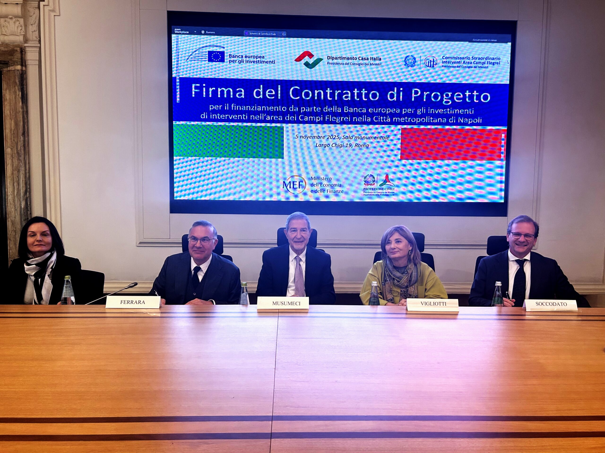 Brussels – Repairing damage, making buildings safe, reducing the vulnerability of homes and infrastructure: the European Investment Bank (EIB) has given the go-ahead for maxi-financing of up to €1.4 billion to reconstruct the Campi Flegrei area after the 2024 earthquakes. The Project Contract was signed by Nello Musumeci, Minister for Civil Protection and Sea Policies, and by Gelsomina Vigliotti, EIB Vice-President. The signing of the first tranche of the financing agreement with the Ministry of the Economy, covering allocations scheduled for 2025, 2026, and part of 2027, is expected before the end of the year.