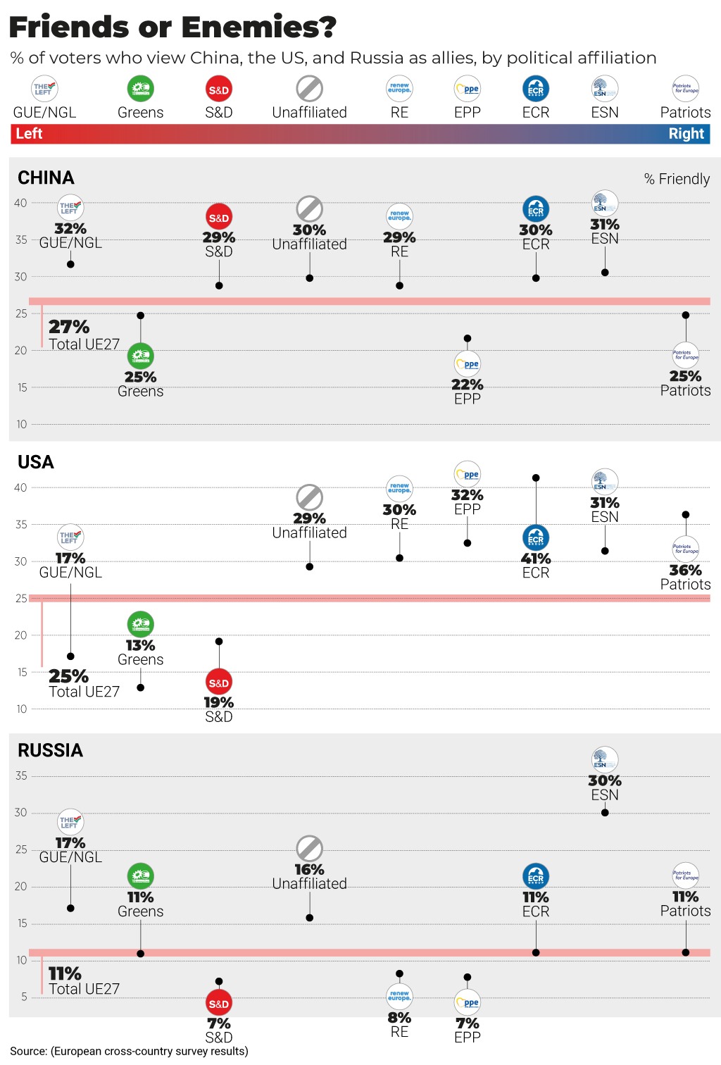 The perception of the United States in Europe marks a clear break between before and after the start of Donald Trump’s second term. In October 2024, before the elections that sealed his victory, 61 per cent of Europeans still considered Washington a friendly country. Today, the scenario has changed radically: only 25 per cent describe the United States as a friendly ally, while 51 per cent now consider it hostile (unfriendly). Twenty-four per cent do not place it in either category. In a global comparison, the United States ranks third from last among countries perceived as friends, ahead of only Russia (11 per cent) and Iran (10 per cent). The European Union now lists the United Kingdom (61 per cent), Japan (60 per cent), Brazil (49 per cent), India (42 per cent), Saudi Arabia (28 per cent), Israel (27 per cent) and China (27 per cent) as its closest countries.