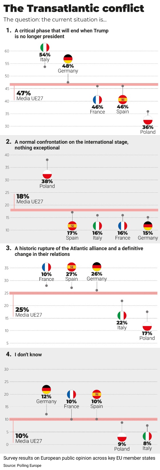 As for transatlantic relations, 47 per cent of respondents believe that Trump is the cause of the discord between the European Union and the United States, but expect this critical phase to end with his term in office. On the contrary, 25 per cent believe that this is not a temporary situation: the rift is considered historic and destined to permanently mark relations with the other side of the Atlantic. Only 18 per cent, on the other hand, speak of a normal confrontation between allies, with no lasting consequences for the future of relations. Significant differences emerge at the national level. Among those who believe that the crisis will end with Trump’s departure from the White House, Italians stand out (54 per cent), while in Poland the figure drops to 36 per cent. Furthermore, among Poles, the idea that this is not a definitive break (only 17 per cent think so) but rather a normal confrontation on the international stage (38 per cent) is more widespread.