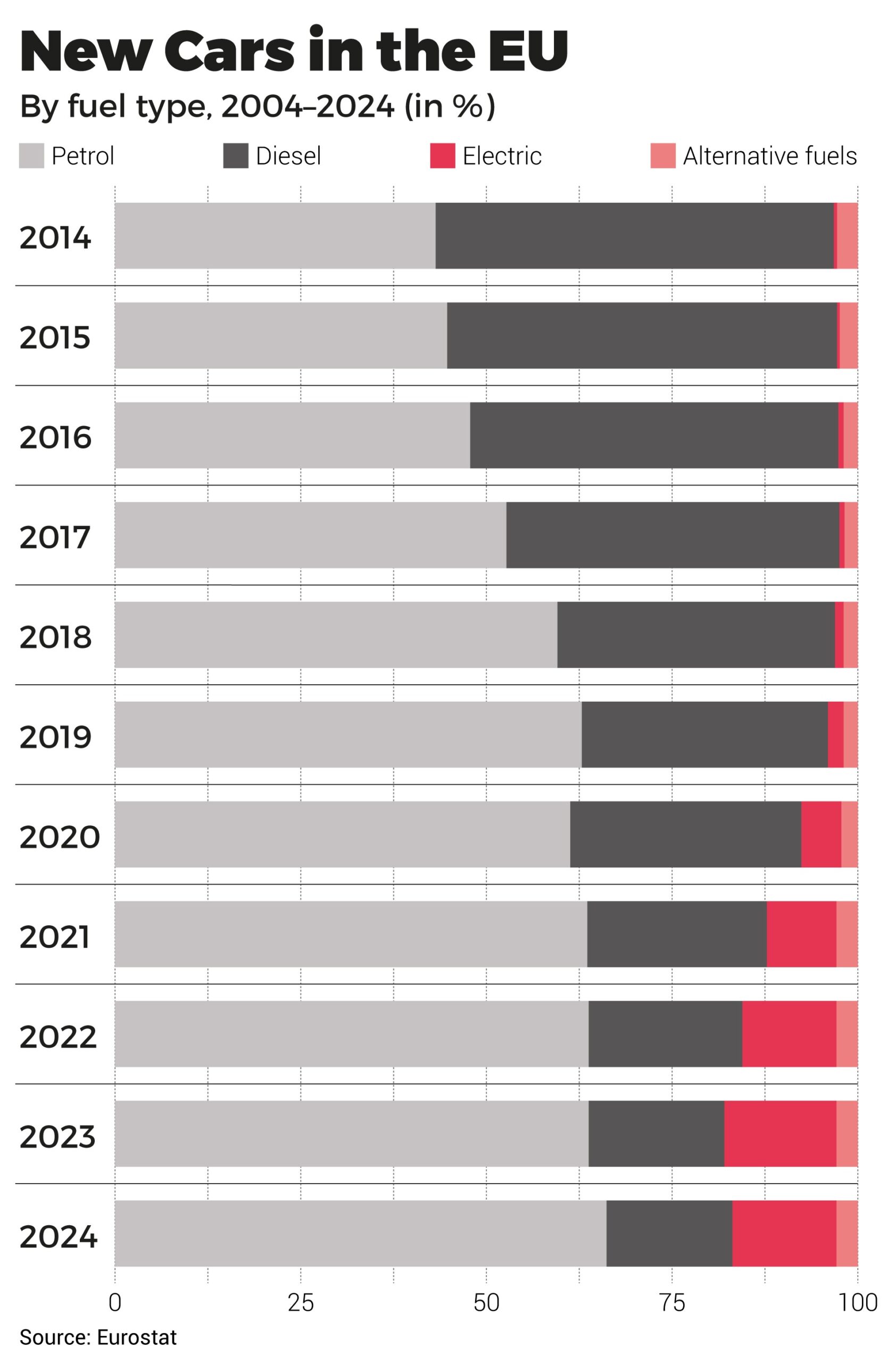 Brussels – Over the course of ten years – from 2014 to 2024 – the number of diesel cars (including hybrids) registered in twenty European Union countries (for which data are available) decreased by 67 per cent, compared to a 60 per cent increase in petrol-powered vehicles (including hybrids). In terms of alternative fuels, however, the number of battery electric cars registered in Europe in 2024 was 45 times higher than in 2014, rising from 0.3 per cent of the total to 13.9 per cent. Finally, registrations of alternative fuel vehicles (LPG, natural gas, hydrogen fuel cells, bioethanol, biodiesel, bi-fuel vehicles, and others) also grew by 13 per cent from 2014 to 2024.
