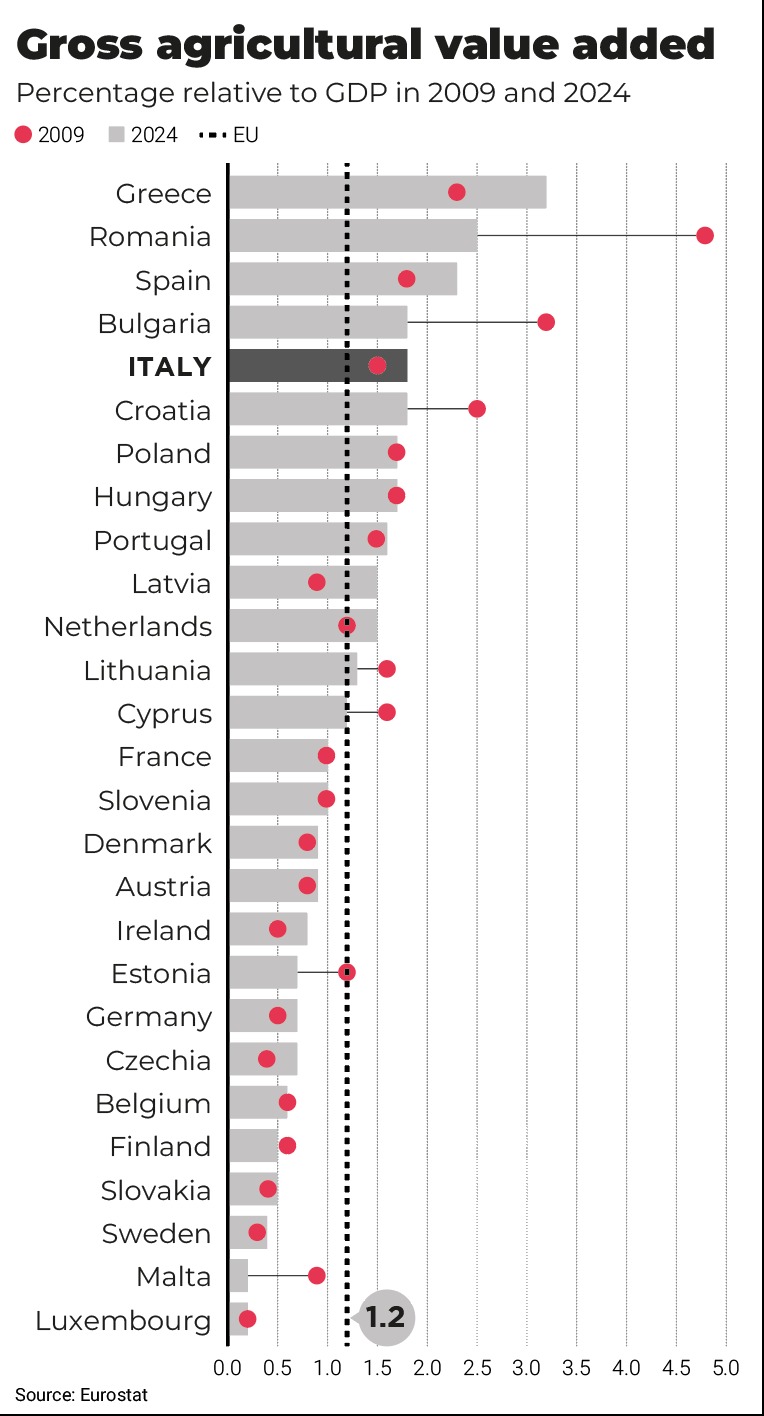 Brussels –Italy ranks fourth among European Union countries in terms of agricultural added value relative to gross domestic product (GDP), at 1.8 per cent, according to a report published by Eurostat, the statistical office of the EU, on the added value of the agricultural industry in Europe. The data refer to 2024, when the entire European agro-industrial sector accounted for an average of 1.2 per cent of the EU’s GDP, 0.1 percentage point more than in 2009.