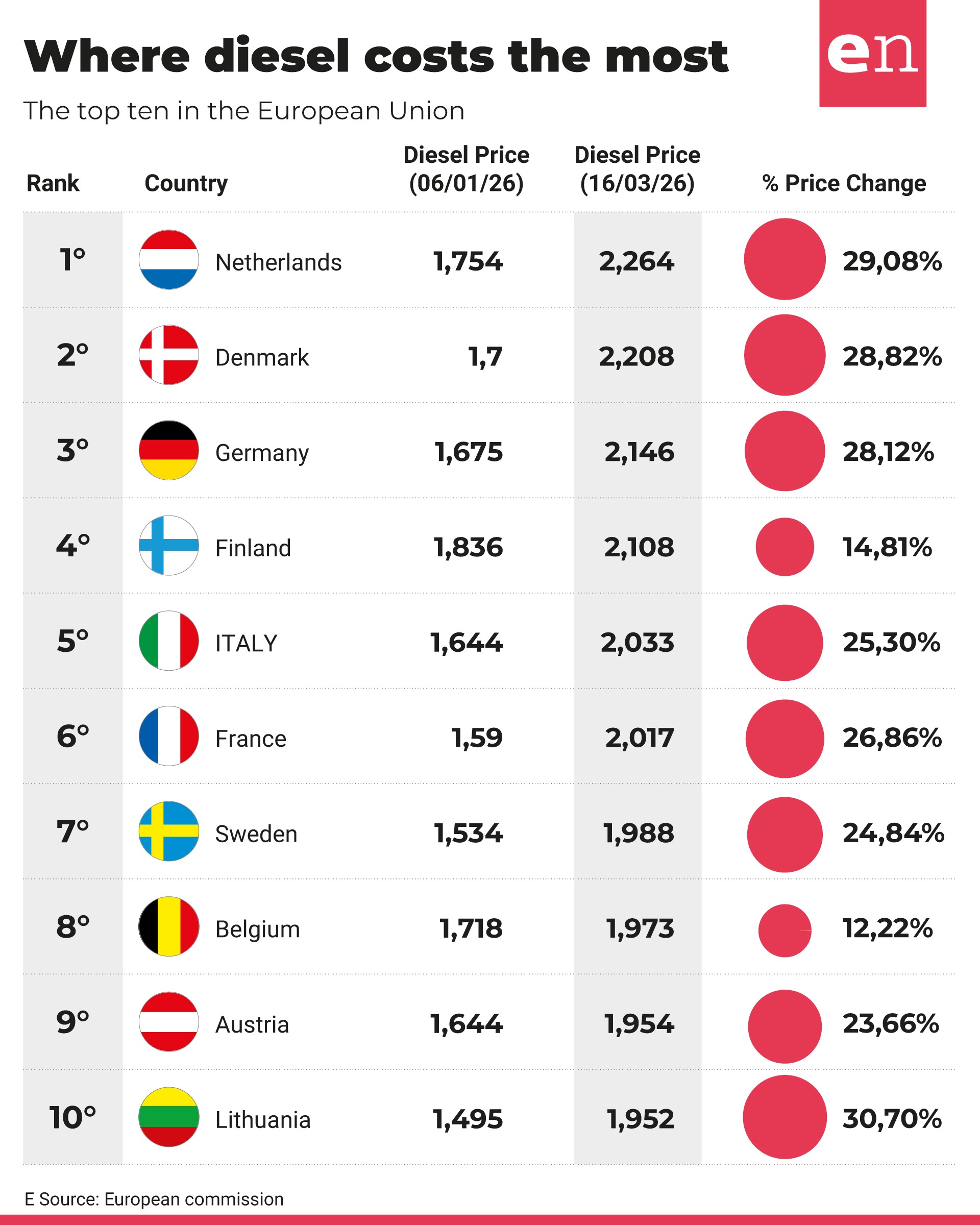 It is on diesel that Italy is suffering the most. Among the 27 EU member states, it ranks fifth for the highest pump prices, with the price rising from €1.644 per litre at the start of 2026 to €2.033 a week ago. Italy is surpassed only by the Netherlands (€2.264 per litre), Denmark (€2.208), Germany (€2.146), and Finland (€2.108). Paying the least, however, are motorists in Malta (€1.21), followed by those in Bulgaria (€1.437), Slovenia (€1.484), Slovakia (€1.528), and Cyprus (€1.589). As with petrol, there was no change in price in Malta. Moderate price rises—at least compared to the EU average—were recorded in Slovenia (+3.49 per cent), Slovakia (+9.06 per cent), Hungary (+11.43 per cent), Ireland (+12.22 per cent), and Cyprus (+13.42 per cent). Meanwhile, the five countries where prices rose the most were Sweden (a surge of 35.15 per cent), Spain (+32.64 per cent), Estonia (+31.09 per cent), Austria (+30.70 per cent), and the Czech Republic (+29.64 per cent). Italy ranks seventeenth, with an increase of 23.66 per cent.
