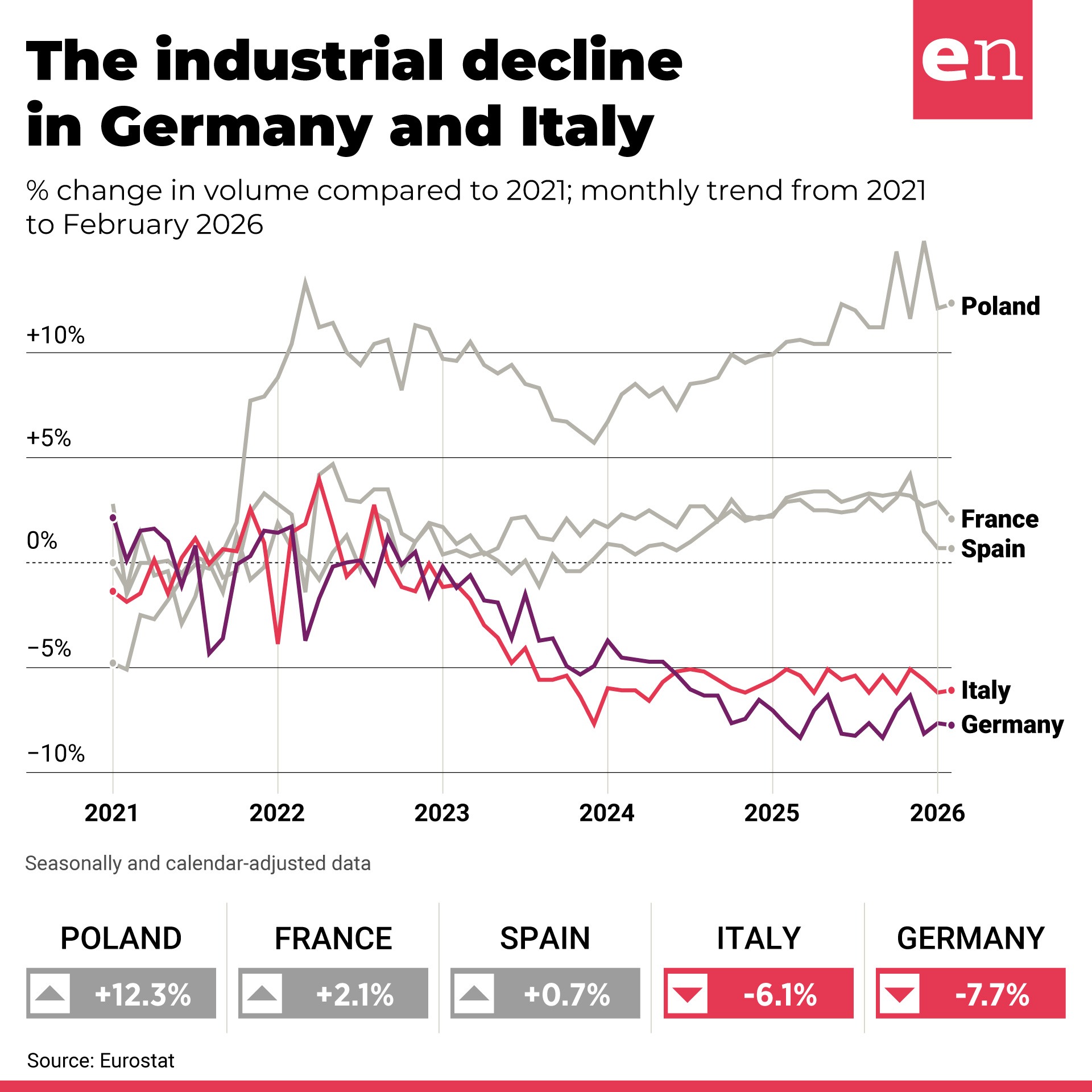 Brussels – Following a poor start to the year, the European industrial sector is showing slight signs of recovery. According to preliminary estimates from Eurostat, in February 2026, industrial production rose by 0.4 per cent in both the euro area and the European Union compared with the previous month. This figure marks a reversal of the trend compared to January 2026, when production had fallen by 0.8 per cent in the euro area and by 0.9 per cent in the EU. The figures from the EU Statistical Office are calculated by aggregating seasonally adjusted national values and are therefore free from variations that recur annually at the same time of year, such as the decline in production during the summer holidays or the increase during the Christmas period. In February 2026, compared with February 2025, industrial production fell by 0.6 per cent in the euro area and by 0.1 per cent in the EU.