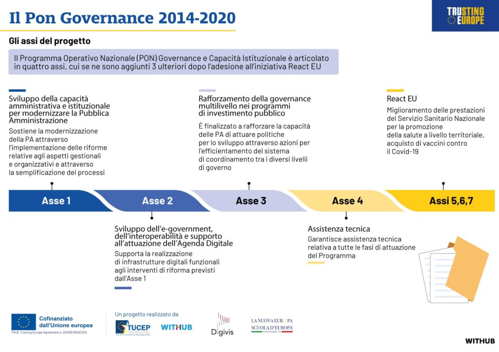 Bruxelles – Il Pon Governance si compone di sette assi principali: Sviluppo della capacità amministrativa e istituzionale per modernizzare la Pubblica Amministrazione, Sviluppo dell’e-government, dell’interoperabilità e supporto all’attuazione dell’Agenda Digitale, Rafforzamento della governance multilivello nei programmi di investimento pubblico, Assistenza tecnica e tre legati al React Eu.