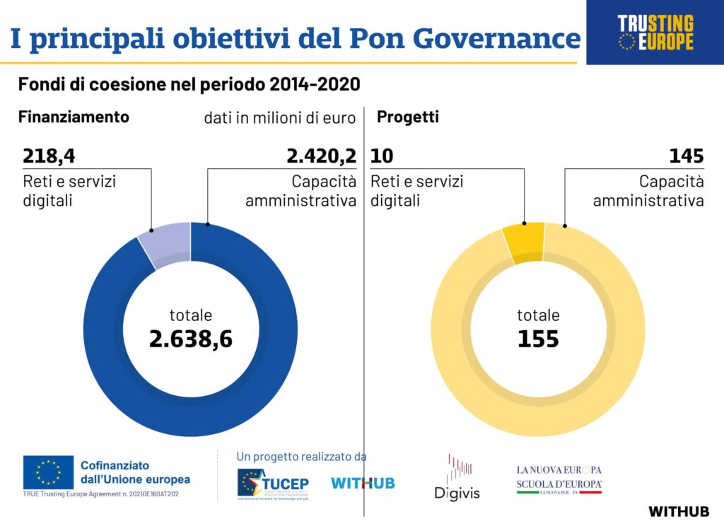 Bruxelles – Dove sono finiti i soldi messi a disposizione dell’Italia per accrescere la propria capacità di governance? TRUE – TRUsting Europe, il progetto sulle politiche di coesione finanziato dall’Unione europea, attraverso un’infografica schematica e riassuntiva, risponde a questa domanda. La quasi totalità dei 2,64 miliardi di euro stanziati per il Pon Governance nel periodo 2014-2020 sono stati spesi per promuovere la capacità amministrativa. Residuale la quota dedicata a reti e servizi digitali.