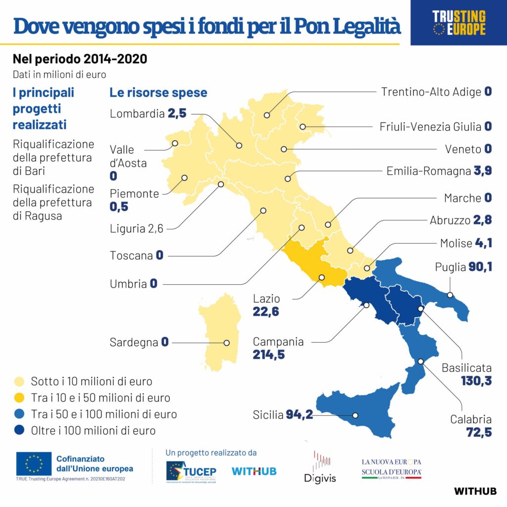 Bruxelles – Dove finiscono i soldi messi a disposizione dell’Italia per accrescere la propria capacità di governance? Chi ne beneficia maggiormente? TRUE – TRUsting Europe, il progetto sulle politiche di coesione finanziato dall’Unione europea, attraverso un’infografica schematica e riassuntiva, risponde a queste domande. La maggior parte dei fondi per il Pon Legalità sono andati alla Campania. Ragguardevole in relazione alla sua popolazione è il contributo ricevuto dalla Basilicata: 130,3 milioni di euro, seconda regione italiana.