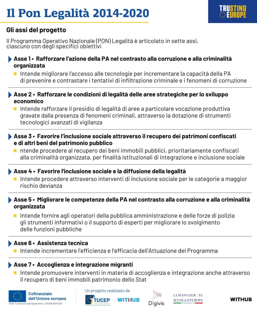 Il Pon Legalità si compone di sette assi principali: Rafforzare l’azione della PA nel contrasto alla corruzione e alla criminalità organizzata, Rafforzare le condizioni di legalità delle aree strategiche per lo sviluppo economico, Favorire l’inclusione sociale attraverso il recupero dei patrimoni confiscati e di altri beni del patrimonio pubblico, Favorire l’inclusione sociale e la diffusione della legalità, Migliorare le competenze della PA nel contrasto alla corruzione e alla criminalità organizzata, Assistenza tecnica e Accoglienza e integrazione dei migranti.