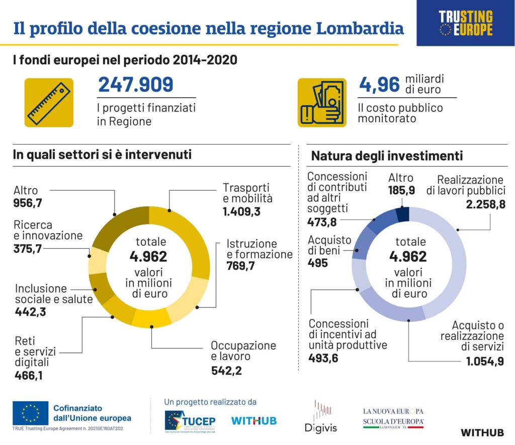 Bruxelles – La Lombardia ha ricevuto 4,92 miliardi di euro nel periodo 2014-2020, che hanno finanziato quasi 250mila progetti. TRUE – TRUsting Europe, il progetto sulle politiche di coesione finanziato dall’Unione europea, attraverso un’infografica schematica e riassuntiva, offre una panoramica sulla natura degli investimenti e i settori in cui si è intervenuti.